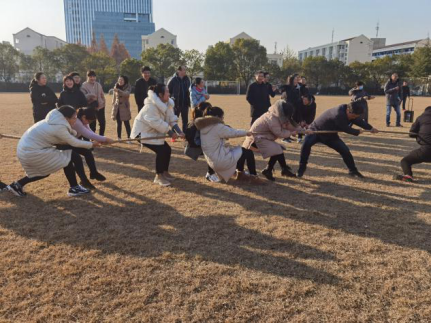 本届趣味运动会共有五项趣味项目“拔河比赛”、“两人三足”、“单腿跳”、“你画我猜”和“抢板凳”。在拔河比赛中,伴随着裁判员的一声令下,每位教师摩拳擦掌,紧抓绳子,双脚抵地,精神抖擞,同心协力向后拉。两人三足齐奔跑,在每位教职工的默契配合以及同学们的加油欢呼声下,一组组教职工团队顺利到达终点。单腿跳项目的比拼考验的是教职工之间的默契与协作。你画我猜的比拼,考验和提高了教职工的想象力和对平常事物的观察力。最终趣味运动会以抢板凳为结尾,在教职工的欢声笑语中拉下帷幕。