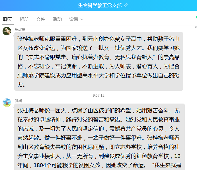 张桂梅同志的先进事迹让全体支部成员深受触动,大家纷纷向张老师点赞致敬,并积极分享了自己的学习心得。