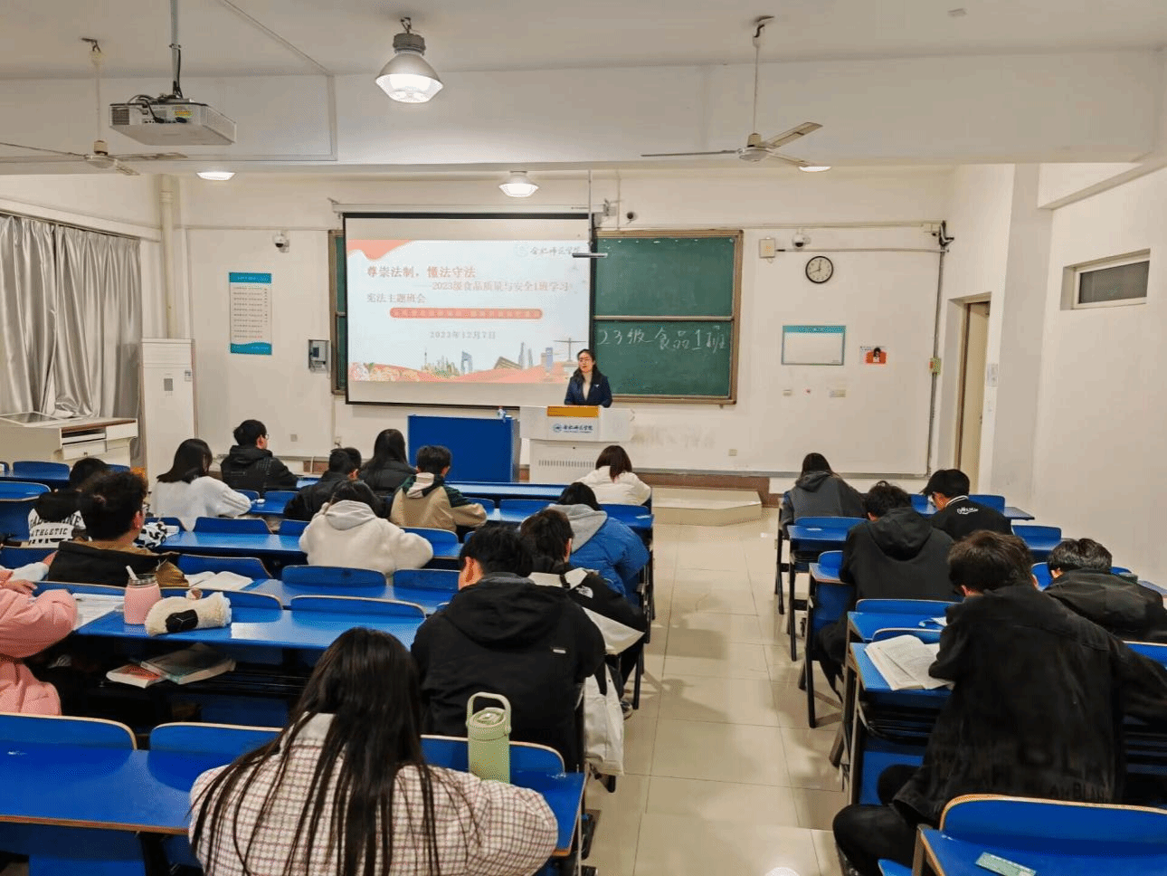 会前,辅导员老师们共同备课,相互讨论,形成了统一的班会课件。班会上,各班主讲人分别围绕宪法的概念、宪法的性质、宪法的特征以及我国宪法的发展等方面为同学们进行了深入细致的讲解,引导同学积极主动进行宪法学习活动,让同学们深刻认识到法治建设的重要性,倡导同学们积极行动起来,做到知法、懂法、守法,共创法治校园。