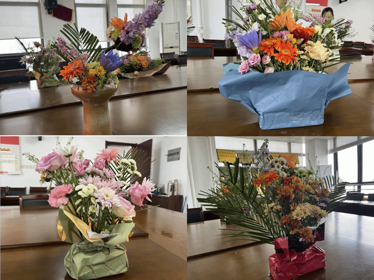 此次活动吸引了众多女教工的热情参与,共计30余名女教师参加了比赛。活动现场,花团锦簇、香气四溢,气氛热烈而温馨。分配好插花材料后,各组老师分工明确,纷纷拿起花枝动手修剪,巧妙搭配,一朵朵鲜花在她们的巧手下变得错落有致,成为一件件清新怡人的精美花艺作品。