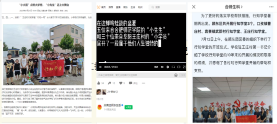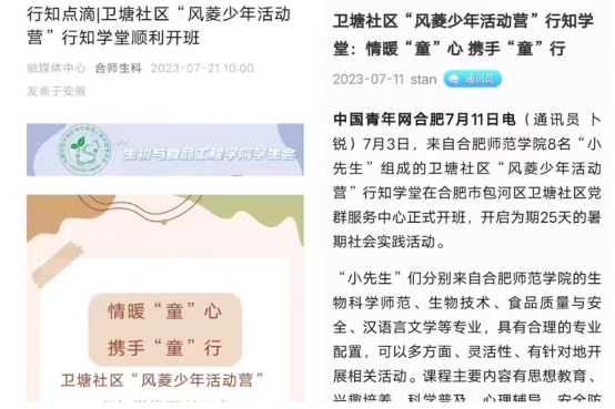 芙蓉社区行知学堂获《中华网》《中青校园》《腾讯新闻》等媒体相继报道17次;谯城区颜集镇李集村“颜”学于心-颜集行知学堂获《中青网》《安徽日报》《安徽检察》等媒体相继报道13次;卫塘社区“风菱少年活动营”行知学堂获《中青校园》《和美望湖》等10家媒体相继报道;阜阳王庄行知学堂获《中青校园》《颍东区共青团》等6家媒体相继报道;先诚行知学堂获《中青校园》《中国大学生在线》等5家媒体相继报道。