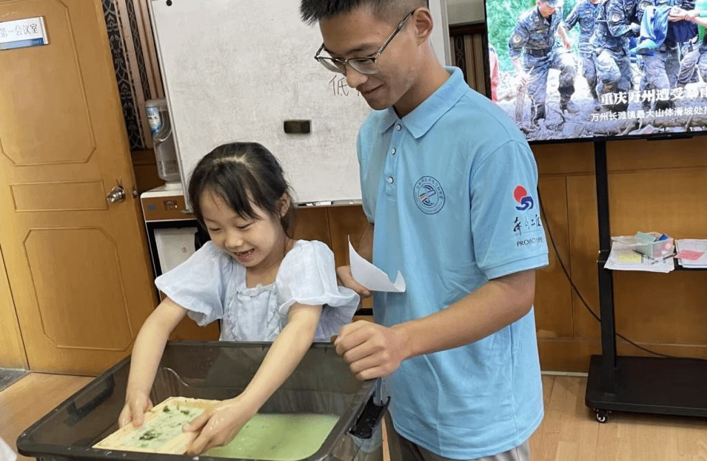 本网讯 7月7日,网投十大信誉可靠平台先诚行知学堂的4位小先生在安徽省教育考试院带领小学员共同开展主题活动“造纸术手工体验”。本次活动邀请了3位安徽农业大学的大学生共同进行造纸体验。
