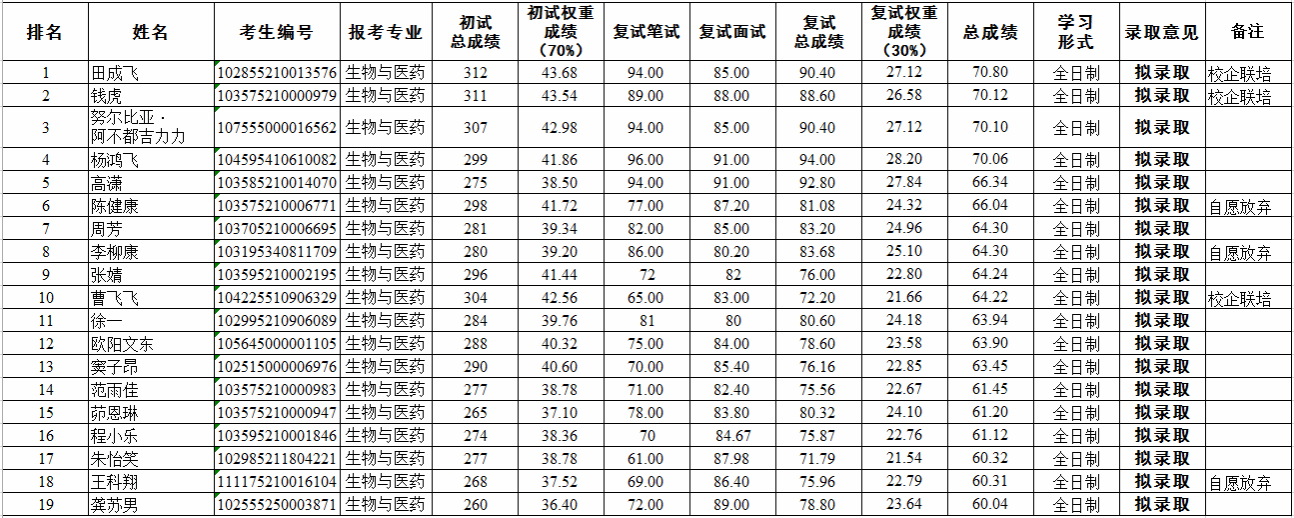 表1 2025年硕士研究生招生(调剂)拟录取结果(生物与医药)