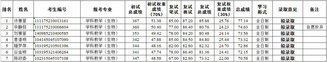 表2 2025年硕士研究生招生(调剂)拟录取结果(学科教学(生物))