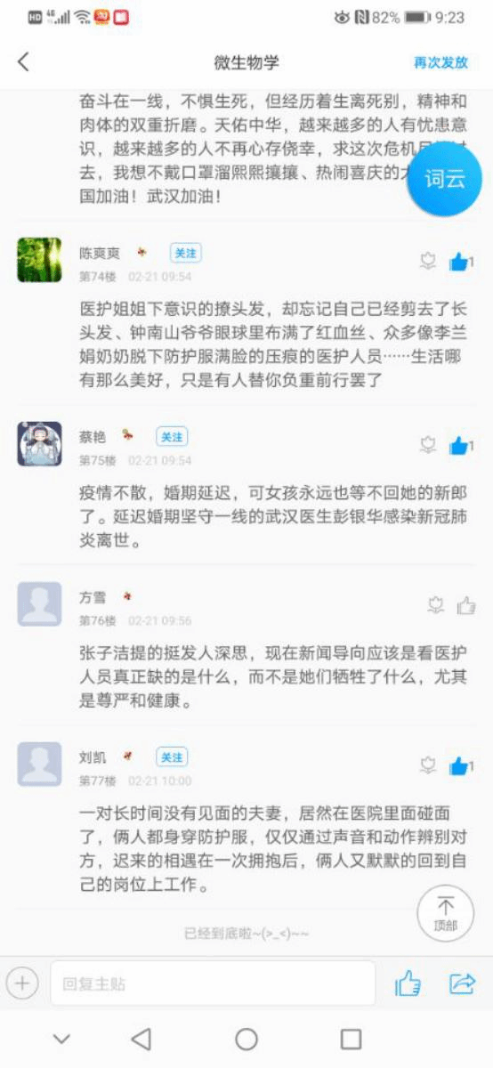 在课堂任务完成后,我提出了本次课的讨论主题“我在录课时谈到新冠肺炎时避开了感性的话题,现在想听听同学们在疫情期间,哪些瞬间让你们感动,伤心,震撼,泪崩……”,53位同学均在讨论区里分享了防控疫情期间的感人故事和动人画面。他们震撼于坚定自信的国家防控措施,众志成城的中国力量,“基建狂魔”的中国速度;感恩于84岁仍然挂帅出征的钟南山院士,“硬核医生”复旦大学附属华山医院感染科主任张文宏医生,安徽医科大学附属巢湖医院ICU凌云护士长等一线的医务工作者们;感动于已是大人模样的90后,爱心捐助的平凡人,接送医务人员的热心武汉市民,默默奉献的年轻志愿者……