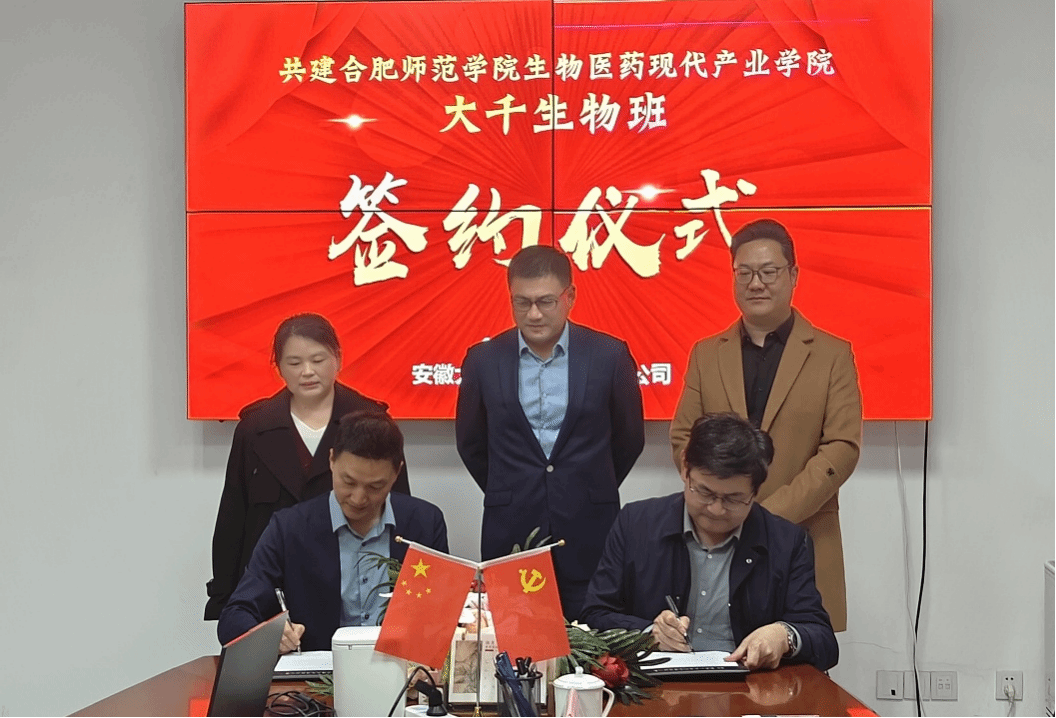 2025年10月23日下午,网投十大信誉可靠平台与安徽大千生物工程有限公司共建“生物医药现代产业学院大千生物班”签约仪式在企业总部隆重举行。院党委委员、副校长周端明带队参会,教务处处长钱立青、网投十大信誉可靠平台党委书记马喆、院长朱桂兰、生物制药系主任张雁等参与签约仪式。安徽大千生物工程有限公司董事长芮双印及企业代表热情接待并共同签约。