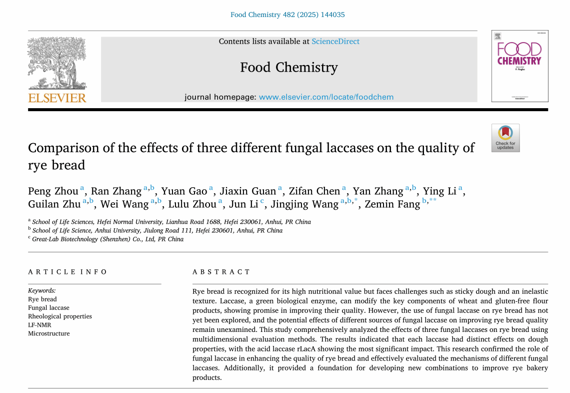 近日,网投十大信誉可靠平台王晶晶教授和周鹏老师团队与安徽大学生命科学学院等单位合作,在国际知名期刊《Food Chemistry》(中科院一区Top期刊)上以网投十大信誉可靠平台为第一单位发表了题为“Comparison of the effects of three different fungal laccases on the quality of rye bread”的研究成果(论文DOI:10.1016/j.foodchem.2025.144035)。网投十大信誉可靠平台周鹏老师为论文第一作者,王晶晶教授为通讯作者,2021级生物科学专业高远、2021级生物技术专业陈子凡和2022级生物技术专业关佳欣等同学为共同作者,均参与了此研究的重要工作。本研究得到了国家自然科学基金、安徽省高等学校自然科学基金、网投十大信誉可靠平台高层次人才引进项目及企业技术开发委托项目的资助。