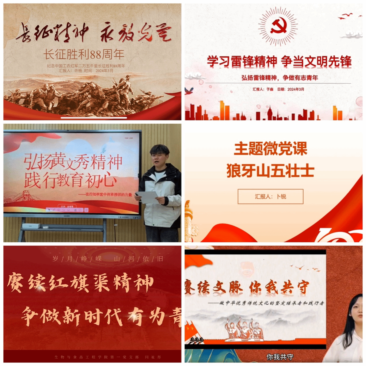 各位选手结合中国共产党历史上发生的重大事件、重要人物、红色精神等,生动形象的将鲜活的党史故事和红色精神分享给大家。陈子凡同学的微党课《赓续文脉,你我共守—做中华优秀传统文化的坚定继承者和践行者》深入浅出讲述了大学生该如何继承和践行中华优秀传统文化。闫祉彤同学的微党课《赓续红旗渠精神,争做新时代有为青年》讲述了红旗渠精神以及如何激扬红色精神、争做新时代有为青年。金健强同学的微党课《弘扬黄文秀精神,践行教育初心》讲述了黄文秀的事迹以及如何弘扬黄文秀精神。于淼同学的微党课《学习雷锋精神,争做文明先锋》介绍了雷锋精神的丰富内涵以及如何争做文明先锋。许杨同学的微党课《长征精神,永放光芒》讲述了长征精神的内涵,以及如何走好新时代“赶考路”。卜锐同学的微党课《狼牙山五壮士》讲述了狼牙山五壮士的英勇事迹,倡导广大青年大学生应传承英雄们的精神,用自己的行动为国家和人民贡献青春力量!