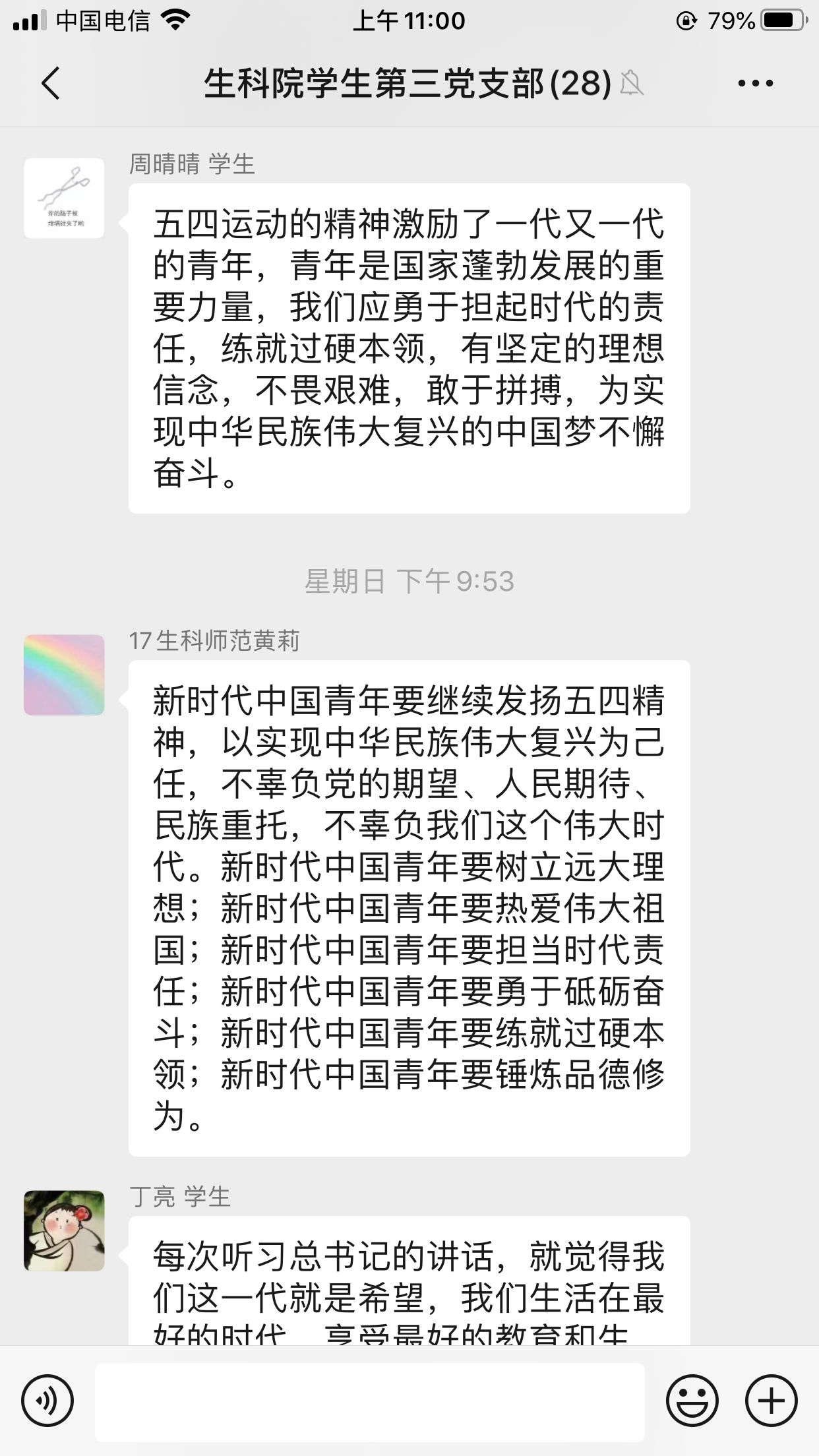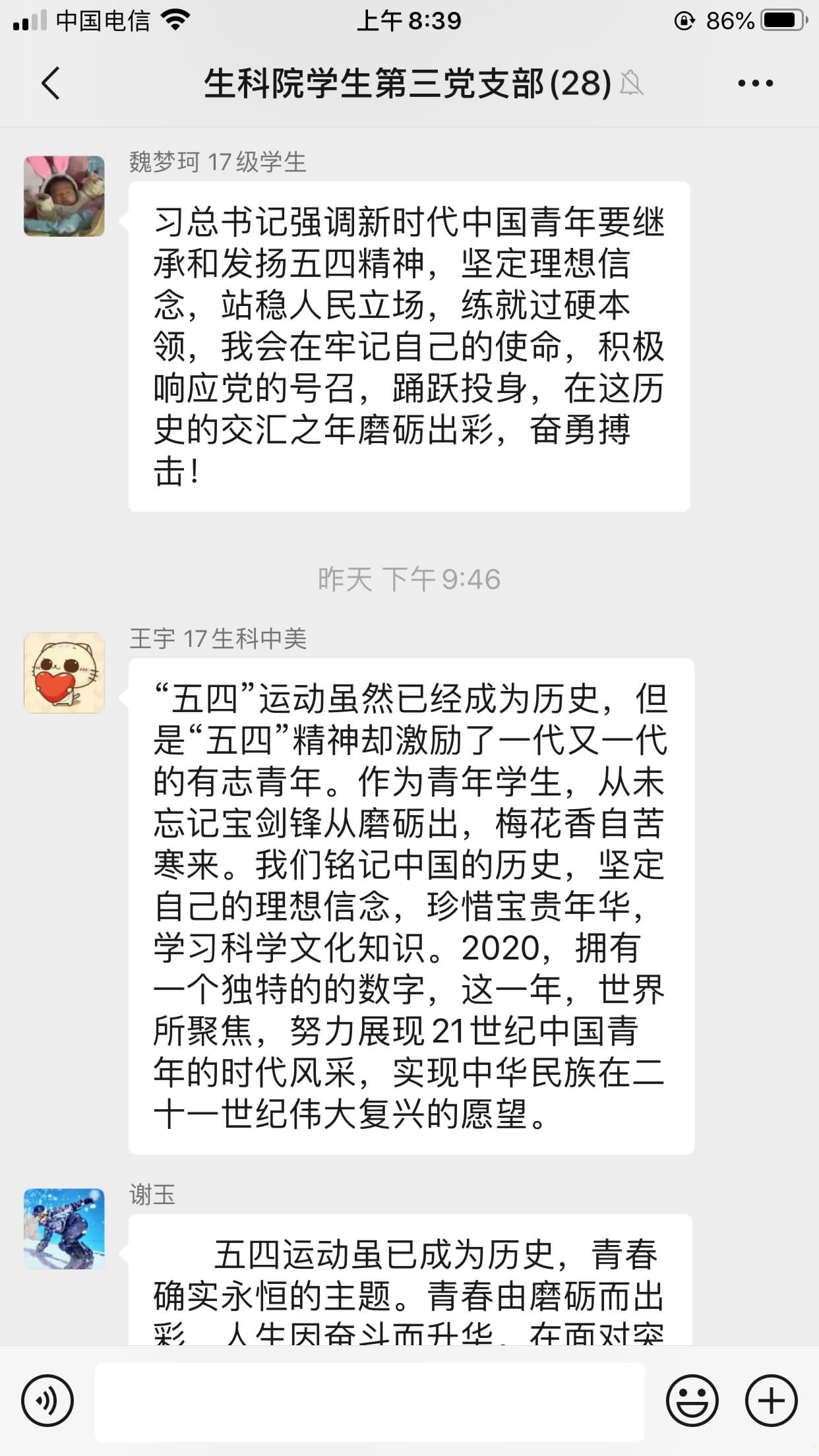 各支部党员结合自己的学习感悟展开讨论交流。2016级周晴晴说:“五四运动的精神激励了一代又一代的青年,青年是国家蓬勃发展的重要力量,我们应勇于担起时代的责任,练就过硬本领,有坚定的理想信念,不畏艰难,敢于拼搏,为实现中华民族伟大复兴的中国梦不懈奋斗!”2017级侯万青说:“我是一名普通的大三学生,‘五四’精神,我们从未忘记,新时代里,焕发出勃勃生机。专注、勇敢、执着,坚持、沉稳、奋进。”2017级王宇说:“‘五四’运动虽然已经成为历史,但是‘五四’精神却激励了一代又一代的有志青年。作为青年学生,从未忘记‘宝剑锋从磨砺出,梅花香自苦寒来。’我会铭记历史,坚定自己的理想信念,珍惜宝贵年华,学习科学文化知识!”每位党员都结合自己的实际感受和理想信念,发表感想,并饱含深情地表达了自己对“五四精神”的理解,句句铿锵,信念坚定。