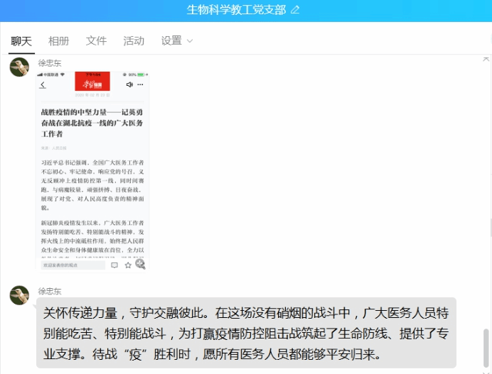 当前,疫情仍未完全控制,抗击疫情形势仍然十分严峻。支部全体教师纷纷表示:作为一名教育工作者要以“偶像”精神激励自己,引导学生保持健康、乐观的的心态,努力学习,回报社会;认真做好线上课程教学工作,结合专业知识帮助学生普及防疫措施;坚持主题学习和实践活动的常态化,不忘初心,牢记使命,用实际行动让党旗在防控疫情斗争中高高飘扬。(生命科学学院:王占军)