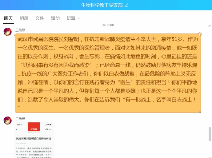 支部全体党员认真学习学习强国中的“抗疫英雄谱”,并积极分享了自己的学习心得:84岁仍然挂帅出征的钟南山院士,73岁力挽狂澜的李兰娟院士,冲锋在前的陈薇院士,武汉市武昌医院院长刘智明烈士,为抗击疫情推迟婚期的武汉市江夏区第一人民医院彭银华烈士,“硬核医生”复旦大学附属华山医院感染科主任张文宏医生,安徽医科大学附属巢湖医院ICU凌云护士长等一线的广大医务工作者们。