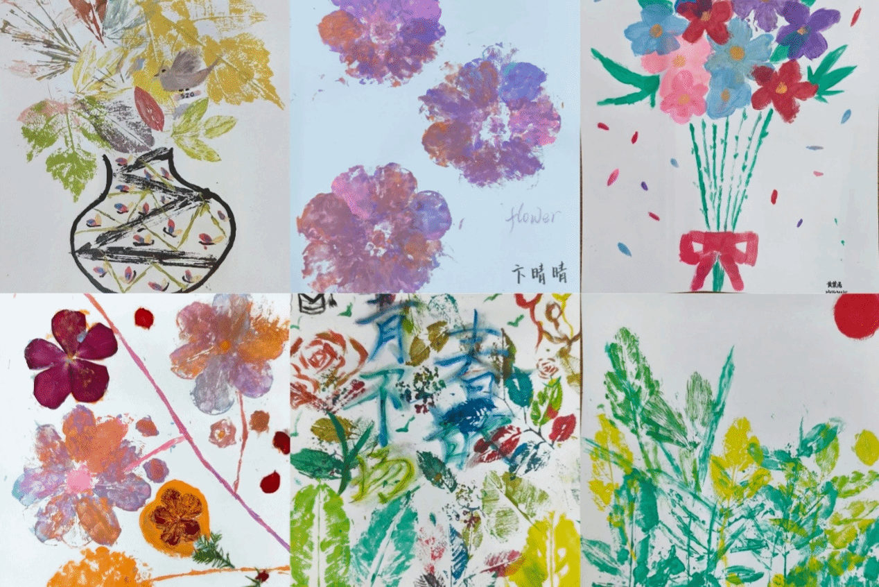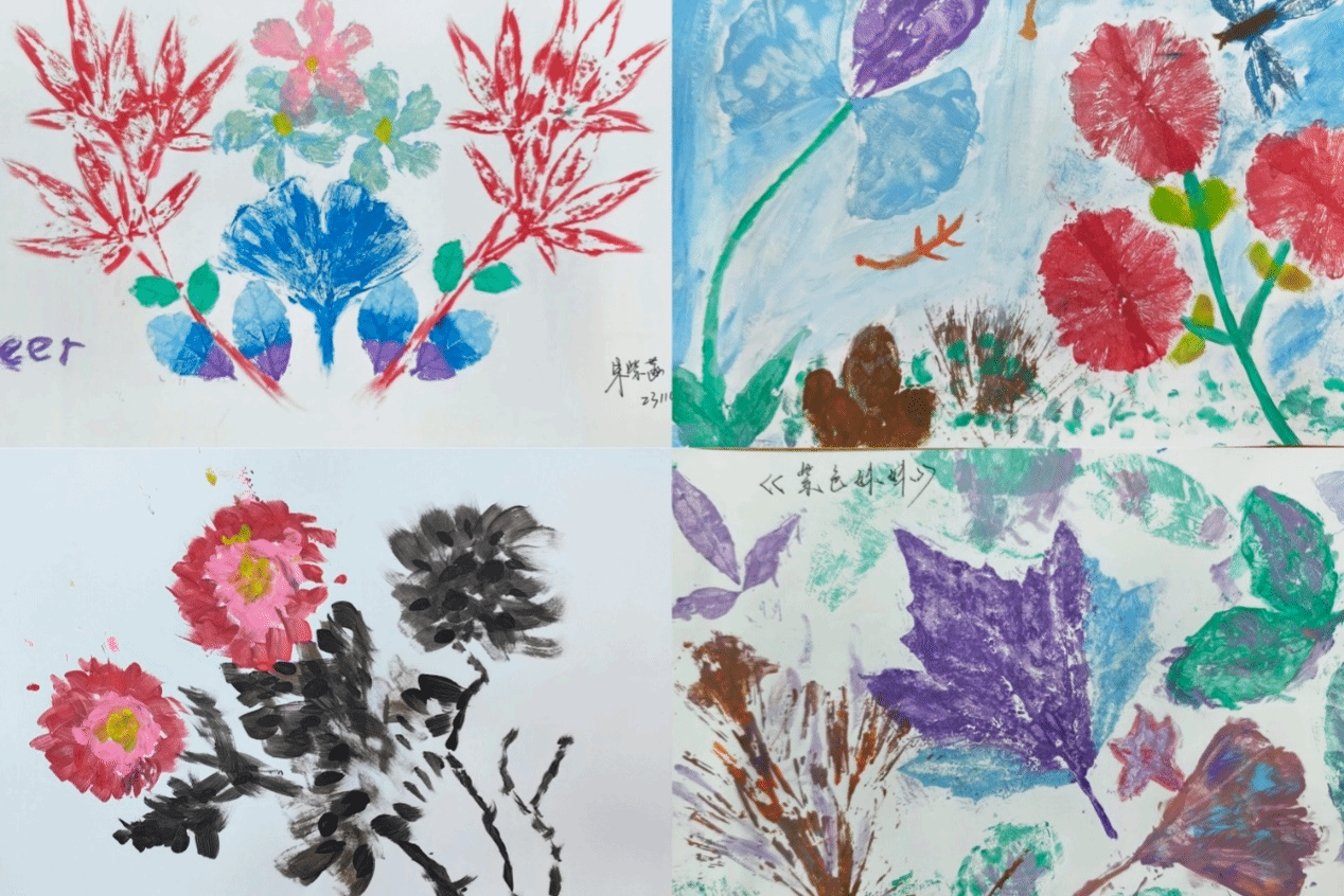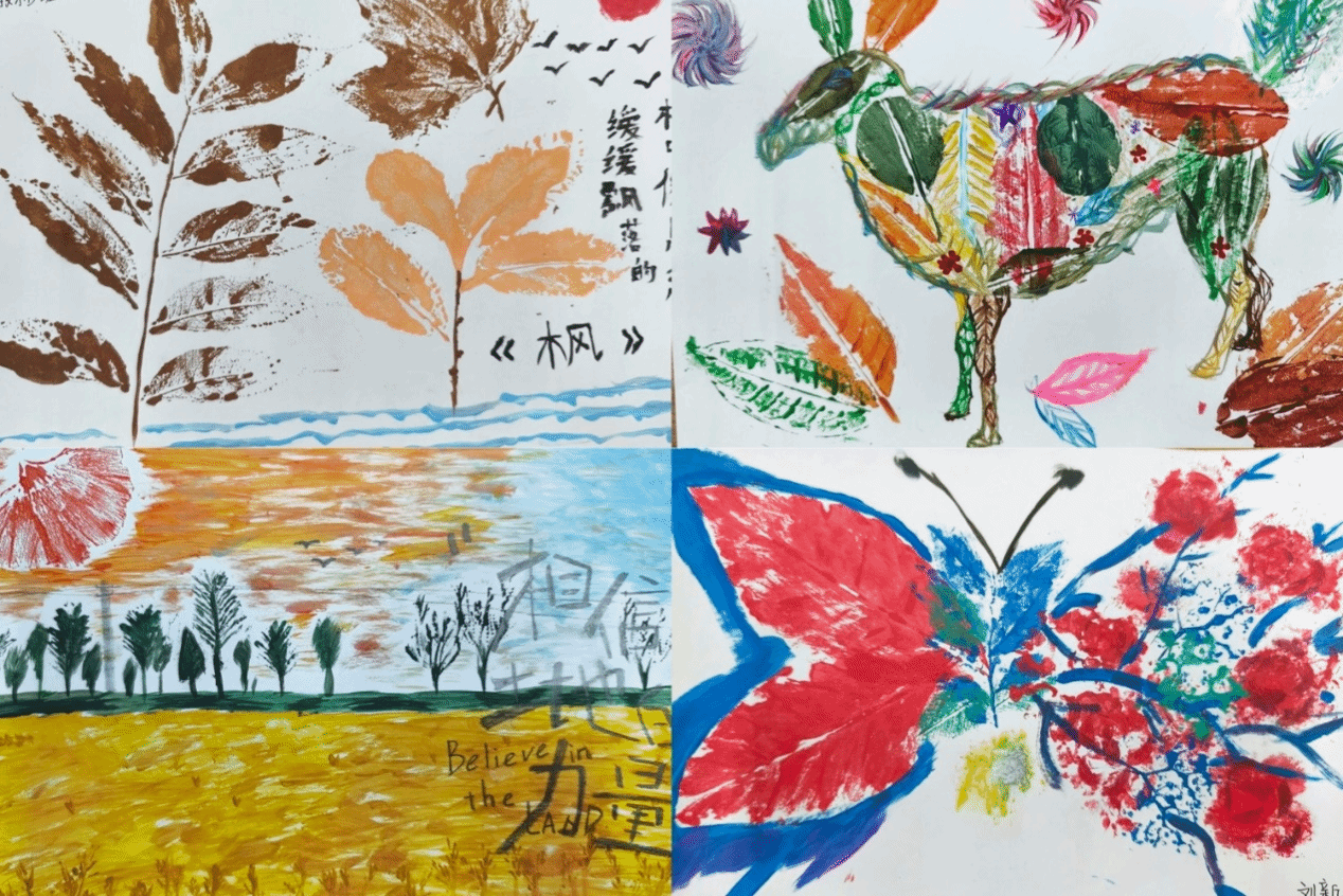 此次活动开展以班级为单位,同学们自行组成团队,用所收集的各式各样的植物树叶蘸取颜料在卡纸上进行印染画创作。