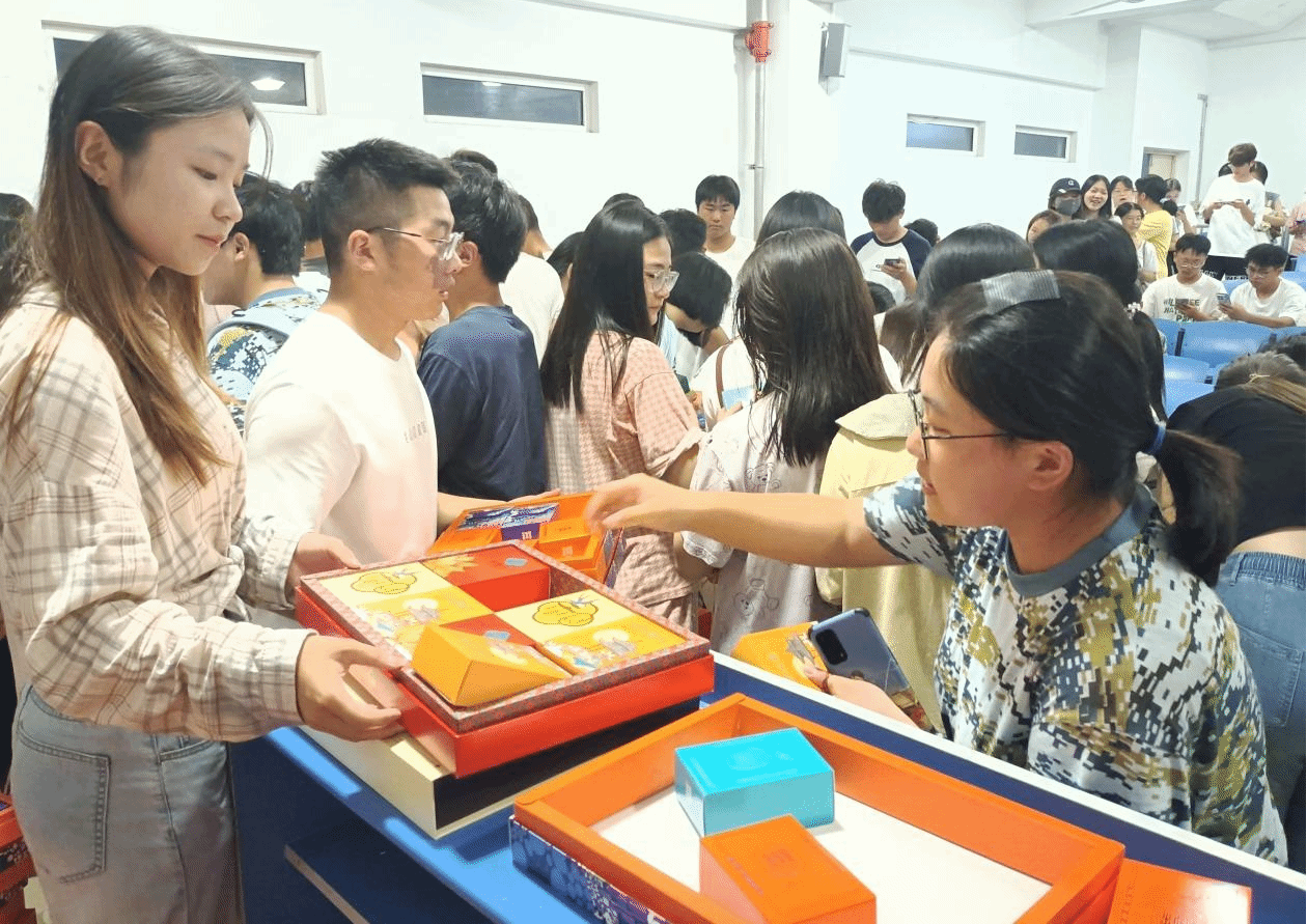 活动现场,工作人员早早地将一盒盒精美的月饼摆放整齐。月饼的种类丰富多样,有传统的五仁月饼、豆沙月饼,也有新颖的流心月饼等,满足了同学们的口味需求。新生辅导员黄洁和学生会干部一起为同学们分发月饼,现场气氛热烈而温馨,同学们的脸上都洋溢着喜悦的笑容,有序地领取着月饼。