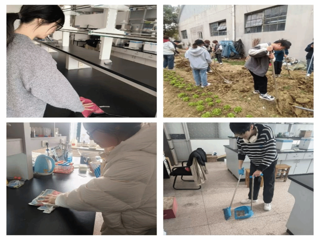 同学们投身蓝莓基地、资料室、实验室等场所进行劳动实践。在蓝莓基地中,学生党支部书记们带领同学们耕土刨地,将汗水泼洒在科技田、行知田等。在实验室、资料室和教室里,同学们认真仔细打扫地面、门窗和桌椅,清理灰尘和垃圾,整理文件资料。在校园劳动中,同学们为校园绿植刷白、修剪、施肥,他们在老师讲解下,更加深刻了解到树木对土壤、水分、光照等环境因素的需求。这些劳动实践活动展现了生物学院青年学子“不怕脏、不怕苦、不怕累”的精神品质,不仅美化了校园环境,同时也增强了集体荣誉感和责任感,感悟到良好的校园环境有利于大家的学习和生活,需要大家用心用情去维护。