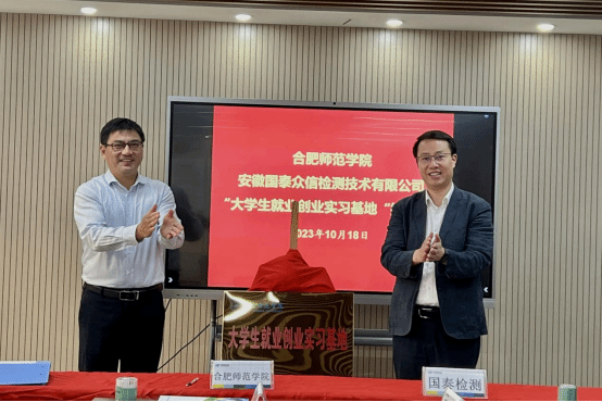 座谈交流结束后,举行了共建实习就业基地揭牌仪式。周端明和陈洪周共同为网投十大信誉可靠平台-安徽国泰众信检测技术有限公司大学生就业创业实习基地揭牌。朱桂兰代表网投十大信誉可靠平台与国泰检测公司签订了就业创业实习基地协议。