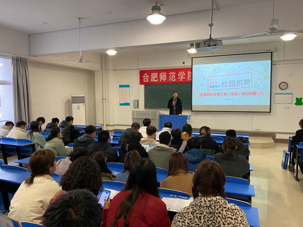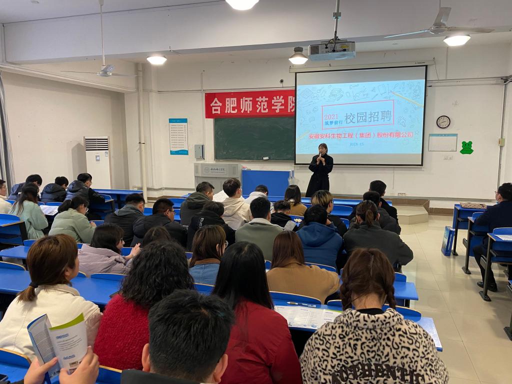 本网讯 为全力做好2021届毕业生就业工作,搭建毕业生与用人单位的沟通平台,应生命科学学院邀请,安科生物于3月19日下午14时在逸夫楼209举办专场招聘会。生科院院长徐忠东、生物技术主任陈金武、辅导员黄伟丽出席了本次招聘会。