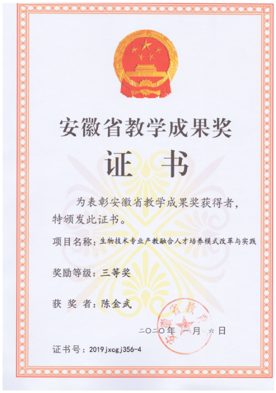 (2)人才培养坚持校企融合模式、注重培养应用型人才。生物技术教研室高度重视教学研究,优化人才培养模式,建立校企融合平台,充分利用学校、企业的资源和优势,把以课堂传授知识为主的学校教育与直接获取实际经验、实践能力为主的生产科研实践有机地结合于学生培养过程之中。在人才培养模式、课程设计、课程考核、教学模式改革等方面积极探究以能力培养为主线的教学方法,改革以“教”为中心转向以“学”为中心,根据课程性质和内容,积极推进启发式、案例式、研讨式、交流式等教学方法运用。近3年教研室获批省级和校级共计20项教研项目,共计经费21.2万,其中省级(部委级)及以上教学质量工程项目13项,并将教学研究成果,贯彻到本科生教学工作中,取得了较好的教学效果。教师在进行教学改革的同时,将教学方法和教学成果整理成论文发表在国内教研期刊上。在教改的基础之上,教研室教师总结教学效果申报并获批3项省级教学成果奖,分别为欧祖兰老师的“基于学科竞赛的大学生主动实践能力培养模式”和陈金武老师的“基于教科研项目驱动的生物专业课程改革的探索与实践”等。教学方法与手段改革得到学生的好评,对本专业教师学生评教的平均优良率(90分以上)达 100%。