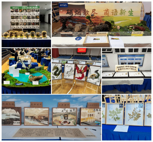 本届安徽省大学生生物标本制作大赛,共有45所高校参赛,作品达300余件,竞争尤为激烈。在历经标本现场展示和队员答辩环节之后,由我院陈倩颖、欧祖兰老师指导,朱佳梦、沈佳奕等同学的作品《菌秀非凡-合肥市常见野生菌品种》荣获真菌组一等奖;周璐璐、黄洁老师指导,史文迪、梅雨寒等同学的作品《硝烟散尽,菌语新生》荣获创意组一等奖;荣获二等奖的作品则是卢璇、周璐璐老师指导的《寻藻鸭踪——巢湖流域五种鸭科动物剥制标本》和高阳、徐浩然老师指导的《徽风承四象-种灵绘江淮》,三等奖作品则是朱小茜、欧祖兰老师指导的《国家二级保护植物秤锤树的特征辨析——基于安息香科2属3种与山矾科白檀的标本对照》、周璐璐、卢璇老师指导的《皖南地区3种常见侧耳属真菌的生活史干制标本》以及方雪老师指导的《食光笺》。